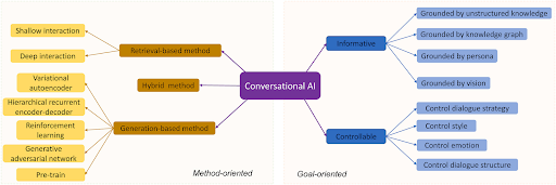 This visual breaks down the two primary approaches to building conversational AI, emphasizing how technical structure (method) and end-user outcomes (goal) shape system effectiveness.