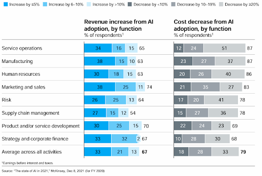 This illustrates the business value of AI across functions, highlighting revenue gains and cost savings in service operations, marketing, HR, and product development.