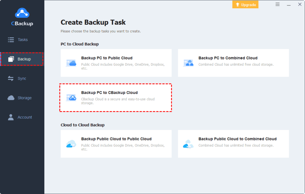 Tip: To back up computer to Google Drive, OneDrive, and other public cloud, please navigate to Storage first to add and authorize your cloud account to CBackup, and choose Backup PC to Public Cloud on the Backup segment.