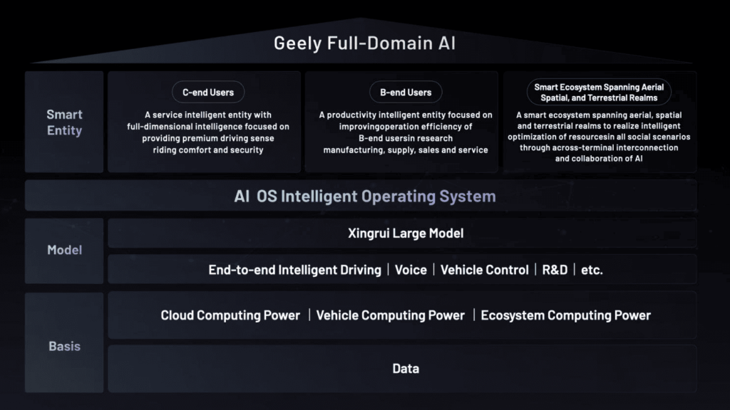 Geely focuses on integrating and applying AI technology in smart vehicles, resulting in a comprehensive “Full-Domain AI for Smart Vehicles” system. This system serves consumer users, enterprise users, and a comprehensive smart ecosystem spanning aerial, spatial, and terrestrial realms. Geely’s Full-Domain AI goes beyond in-vehicle AI, offering a broader range of functionalities. Its ultimate goal is to create a native “Autonomous Intelligence for Mobility” that is warm, empathetic, and continuously evolving.