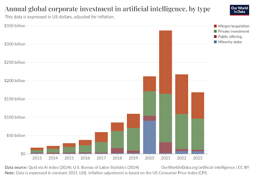 The graph above highlights the exponential growth of AI investment across categories such as mergers, private offerings, and minority stakes. The precise data illustrates that organizations increase their AI budget investments because AI serves as their strategy for operational resilience.