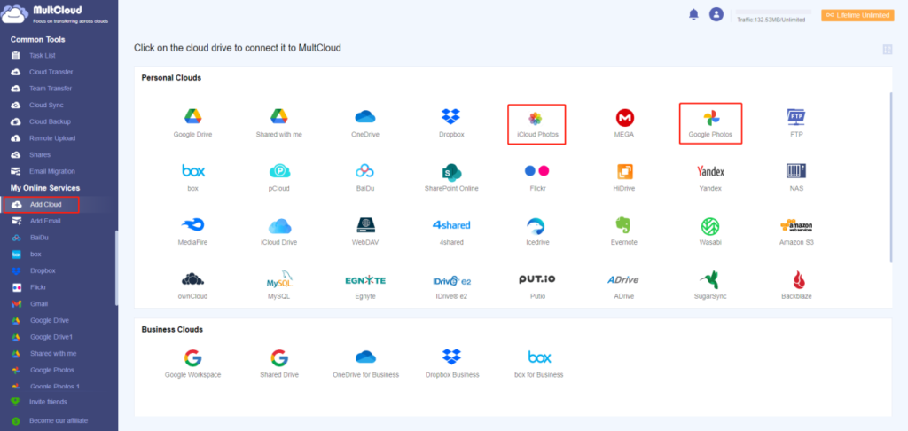 Step 2: Adding Google Photos and iCloud Photos to MultCloud
