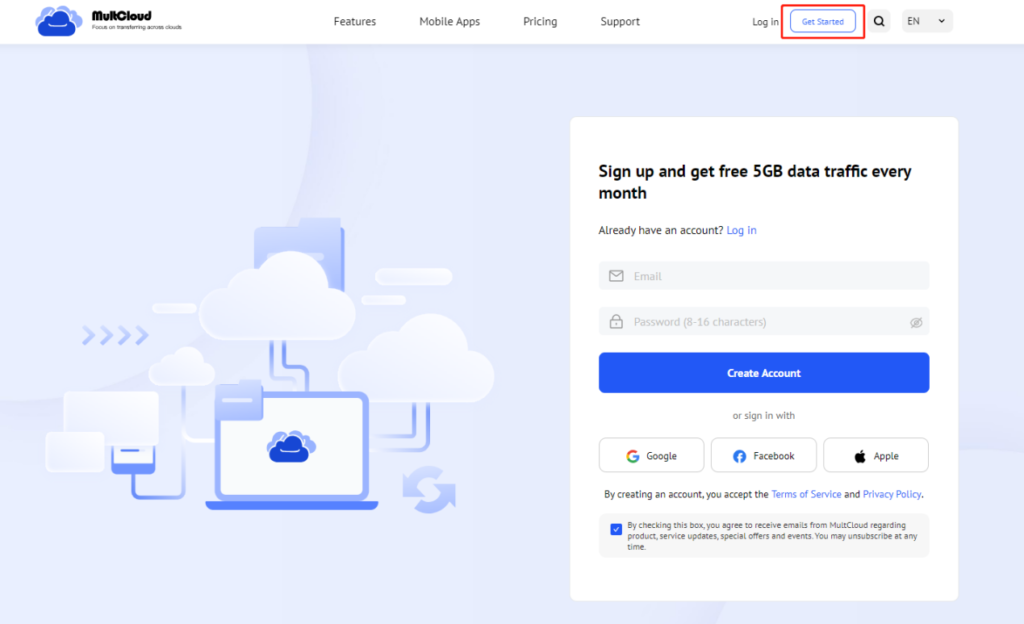 Head over to MultCloud’s website and create a free account.
