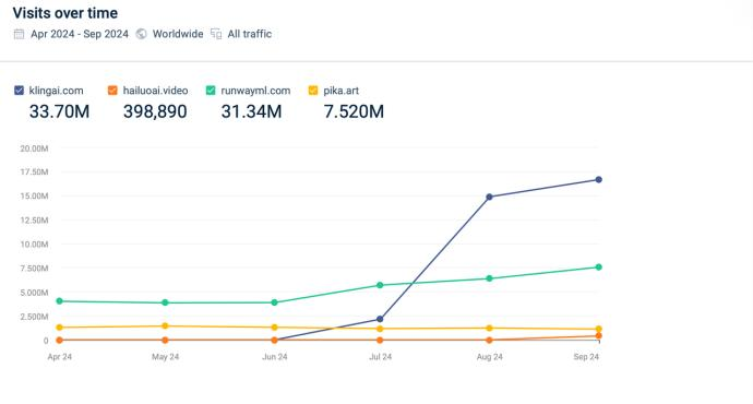 According to data from the authoritative web analytics tool Similarweb, Kling has experienced impressive growth in traffic compared to other AI video products released around the same time. As of September 24, Kling’s total visits had reached 33.7 million, surpassing the offerings of Runway (31.34 million) and Pika (7.52 million). Additionally, the third-quarter 2024 financial report from Kling’s parent company, Kuaishou Technology, revealed that Kling now has over 5 million users, having generated more than 51 million videos and over 150 million images.