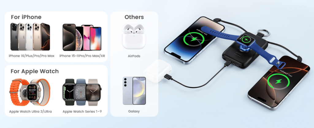 What really stands out is its compatibility. It works perfectly with my iPhone 16 Pro, Apple Watch, and even my AirPods! I recently used it to charge all three while on the go, and it handled everything flawlessly. The purple color is a nice touch—stylish and easy to spot in my bag. It’s also my favorite color! lol