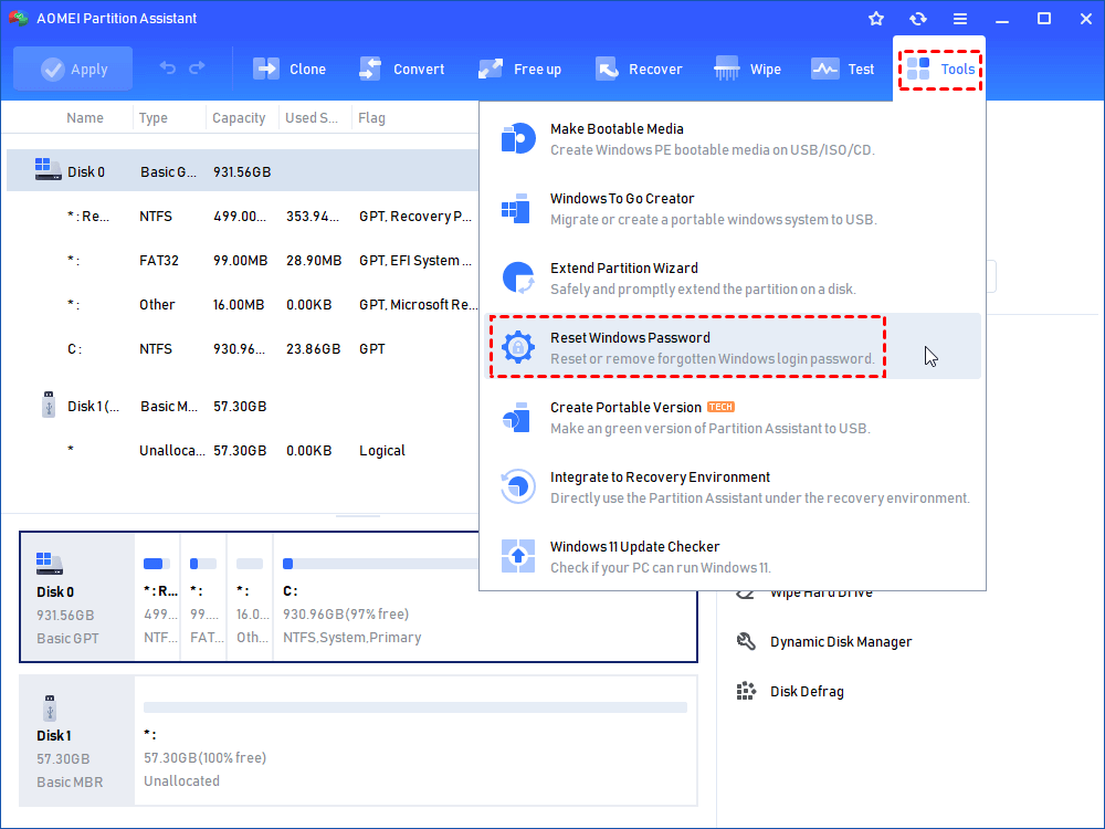 Step 1. First, plug the USB into the PC. Then, run AOMEI Partition Assistant and click “Reset Password”.