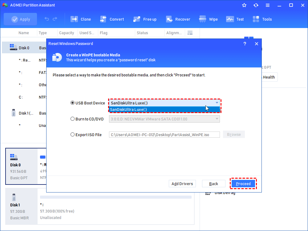 Step 3. Here, choose the prepared USB drive and click “Proceed”.