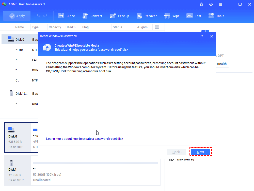 So, the most straightforward solution is to choose a third-party Windows password recovery tool for your Windows 10. AOMEI Partition Assistant is capable of creating a portable tool for Windows 10 password recovery. It also allows you to remove or reset local passwords under WinPE without the need to create them beforehand.