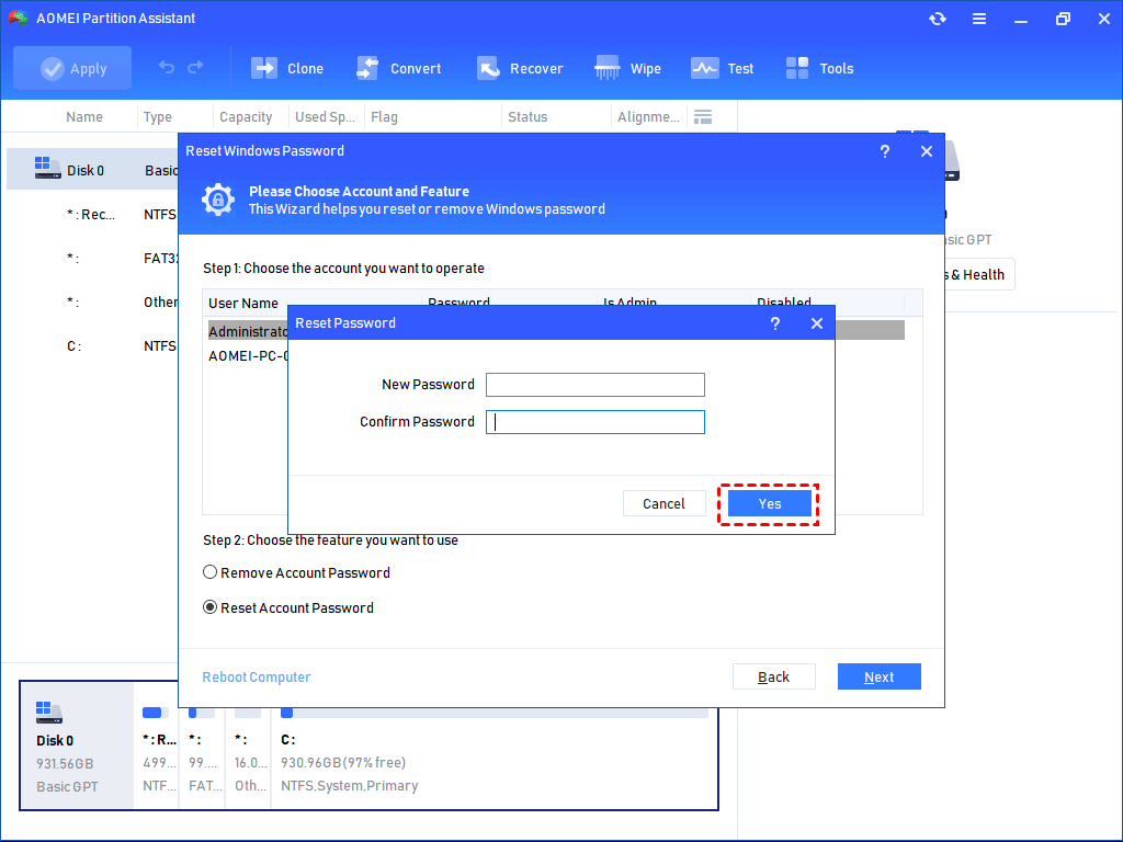 Step 4. To reset the password, type in the new password and password hint. Finally, click “Yes”.